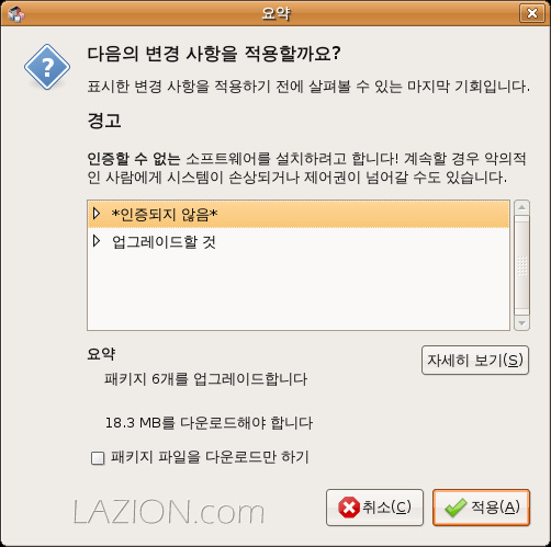 한번 설치된 모듈은 주기적으로 업데이트를 체크하여 언제나 최신 버전을 유지할 수 있도록 업데이트할 수 있습니다. 윈도 업데이트와도 비슷한 거지만 좀 더 규모가 넓다고나 할까요. 이번에 새로 나온 우분투 8.04로도 업데이트할 수는 있습니다만, 아직 드라이버가 준비되어 있지 않아 권장할 수는 없네요. 나올 때까지 기다려야 하겠습니다.