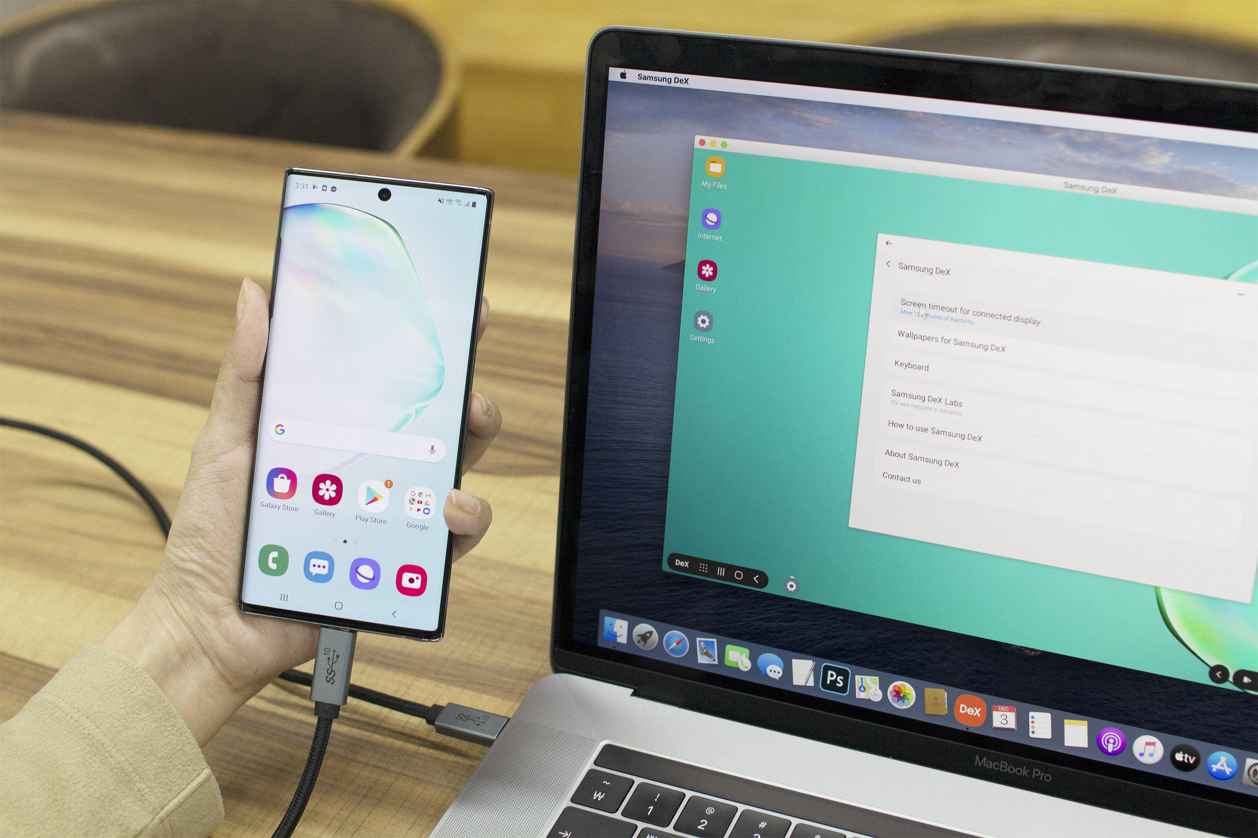 커넥티비티 스택은 DeX 가운데에서도 갤럭시 노트10에 추가된 윈도우 PC나 맥에서 USB 케이블 연결 만으로 데이터 전송 및 DeX를 활용할 수 있는 DeX for PC를 구현하는데 들어간 것으로 보입니다. 별도의 비싼 장비를 구입할 필요가 없이 USB 타입 C 케이블만으로도 DeX를 활용할 수 있게 되어 제법 호평을 받은 기능이지요. 위의 사진에 나온 화면도 맥에 USB 타입 C 케이블을 연결하여 쓰는 모습이지요.