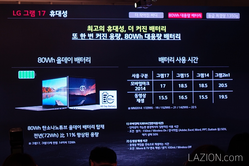 그런데 또 한가지 놀라운 부분은 바로 배터리가 더 늘었다는 점이죠. 무게는 거의 바뀌지 않았지만 배터리 용량은 기존의 72Wh에서 80Wh로, 11%나 늘어났습니다. 뭔가 뺀 것도 없이 LG전자가 무슨 짓을 한 걸까요.