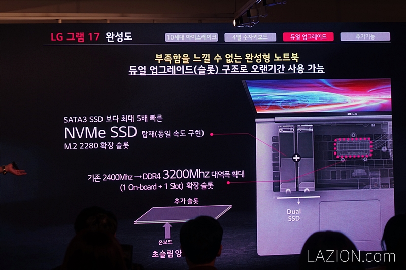 2020년형 LG 그램 17은 잘 안 보이는 부분에서도 손질이 들어갔습니다. LG 그램 시리즈는 듀얼 업그레이드라는 이름으로 램과 SSD를 확장할 수 있게 되어 있습니다.