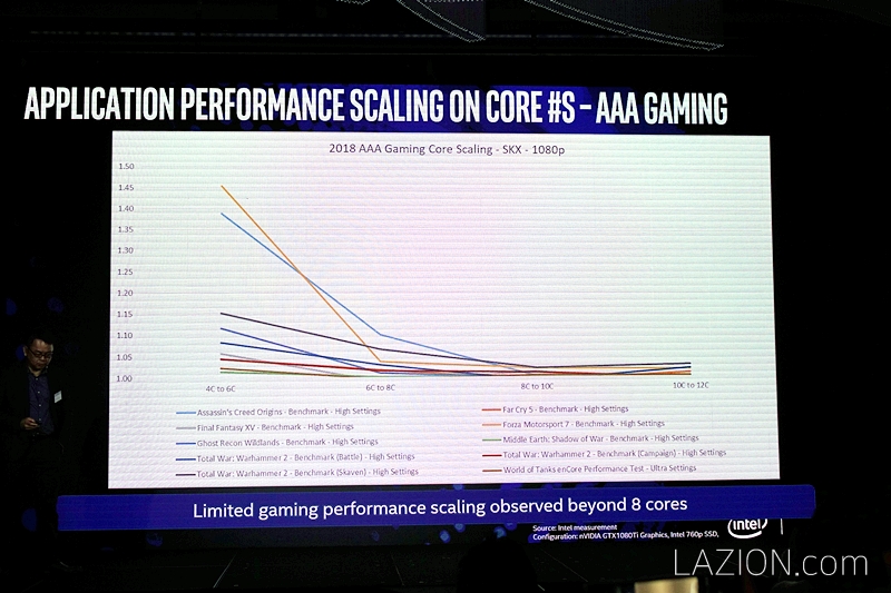 AMD 라이젠이 장기로 삼는 많은 코어에 대한 부분도 지적하고 있습니다. 인텔 측의 시험 결과에 따르면 대부분의 게임은 최대 8코어가 넘어가면 별다른 성능 향상을 보이고 있지 않다고 하는군요. 물론 이건 2019년말 현 시점의 이야기입니다.