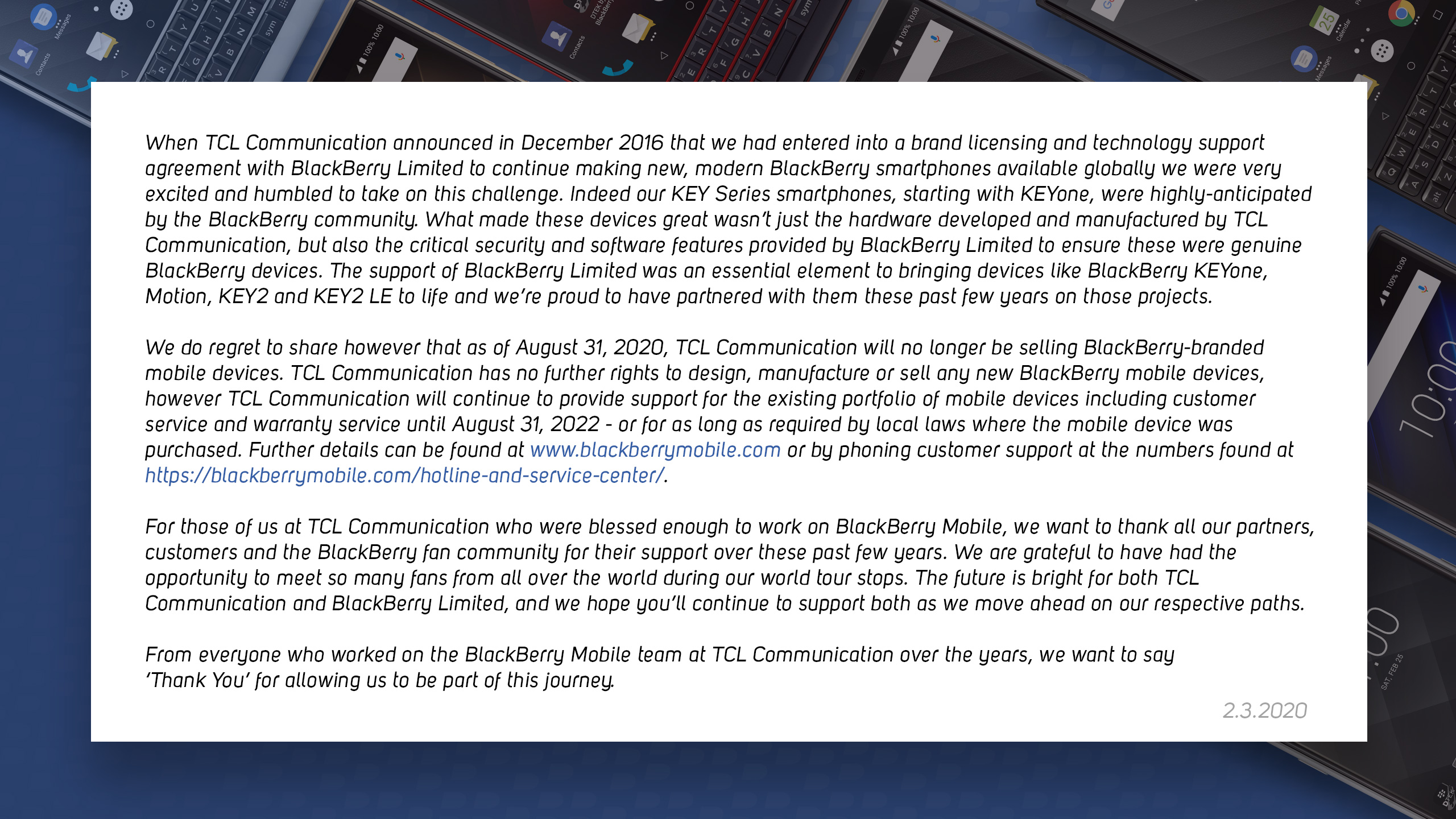 블랙베리의 공식 트위터에 따르면 TCL은 2020년 8월 31일까지만 블랙베리 브랜드 스마트폰을 팔 것이며 최대 2022년 8월 31일까지 고객 서비스 및 보증 서비스를 제공할 것이라고 합니다. TCL을 대신해서 다른 스마트폰 제조사가 나선다면 몰라도 이대로는 시장에서 블랙베리 스마트폰을 더 이상 보기는 힘들 것 같습니다.