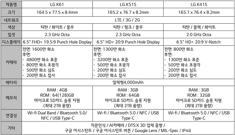 하지만 화면 자체는 좀 다릅니다. K61은 FHD+ 해상도에 19.5:9 펀치홀 디스플레이, K51S는 HD+ 20:9 펀치홀 디스플레이, K41S는 20:9 V노치 디스플레이가 들어갑니다.