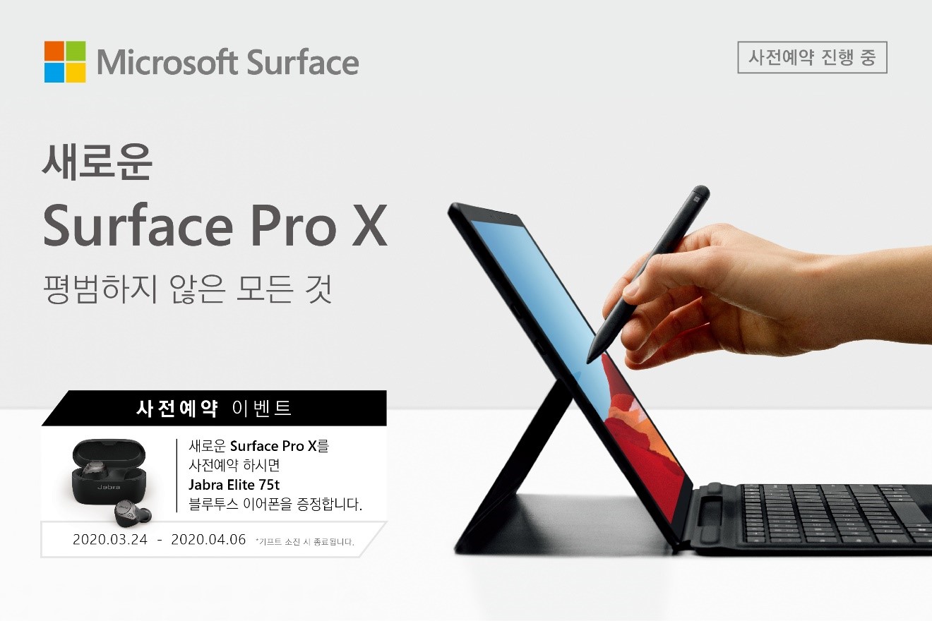 서피스 프로 X 256GB 모델은 전국 롯데하이마트, 일렉트로마트 등 오프라인 매장과 지마켓, 옥션, 11번가, 위메프, 쿠팡, 이마트몰, 하이마트몰 등 온라인 쇼핑몰을 통해 예약 구매할 수 있습니다. 사전 예약 구매자에게는 차세대 프리미엄 무선 이어폰 자브라 엘리트 75t(Jabra Elite 75t)를 사은품으로 증정합니다.