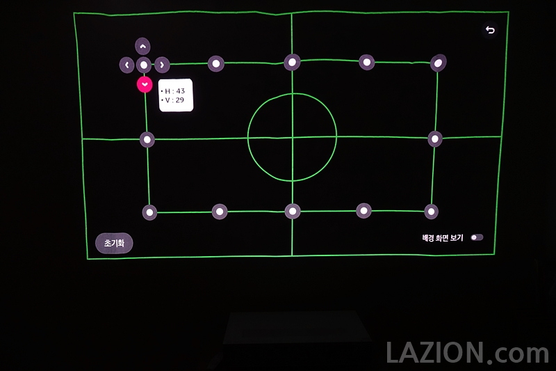 기본 세팅 또한 어렵지 않습니다. 키스톤 설정 또한 다른 제품보다 많은 12포인트를 조정할 수 있게 되어 있어 보다 세밀한 설정이 가능합니다. 다만 단초점 프로젝터의 특성상 제품의 화질을 제대로 느끼려면 전용 스크린을 이용해야 합니다만, 라지온에서는 구할 수 없어 그냥 벽을 이용했습니다.