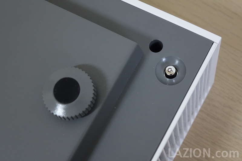 윗면에는 빔이 나가는 유리 패널이 준비되어 있습니다. 여기서도 이 제품의 장점이 하나 더 보이는데, 렌즈가 바로 노출되어 있지 않아 오염이나 파손 위험이 적다는 것이죠. 필요하면 이 유리 패널을 부드럽게 닦아주면 됩니다.