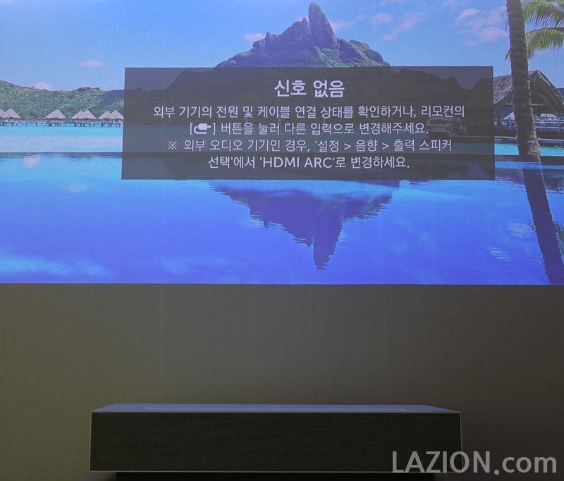 기본 세팅 또한 어렵지 않습니다. 키스톤 설정 또한 다른 제품보다 많은 12포인트를 조정할 수 있게 되어 있어 보다 세밀한 설정이 가능합니다. 다만 단초점 프로젝터의 특성상 제품의 화질을 제대로 느끼려면 전용 스크린을 이용해야 합니다만, 라지온에서는 구할 수 없어 그냥 벽을 이용했습니다.
