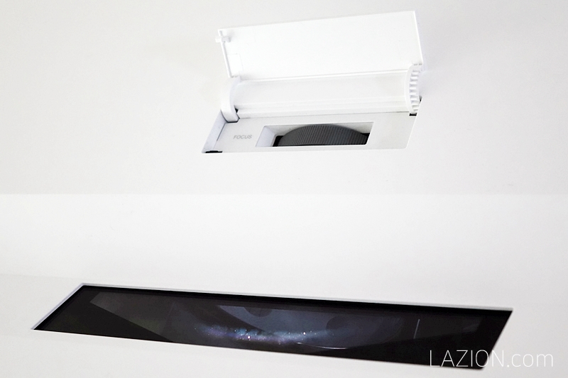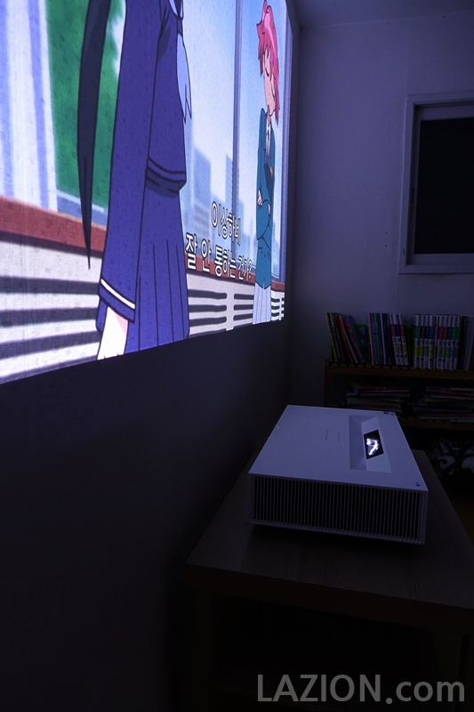 이 제품을 실제로 써보면서 제일 먼저 느끼는 부분은 역시 단초점 프로젝터라는 점입니다. 겨우 10cm의 초점 거리만으로 100인치 크기의 화면을 즐길 수 있으며 거리를 좀 더 늘리면 최대 120인치까지도 확대됩니다.