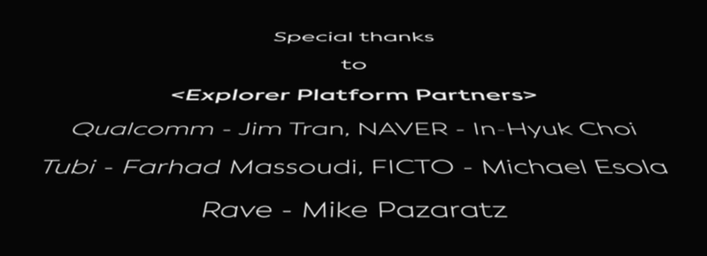 맨 처음에 나오는 것이 감사를 표한다는 메시지와 함꼐 익스플로러 플랫폼 파트너즈(Explorer Platform Partners)라는 이름으로 퀄컴과 네이버, 투비(tubi), 픽토(FICTO), 레이브(Rave)라는 회사가 나옵니다.