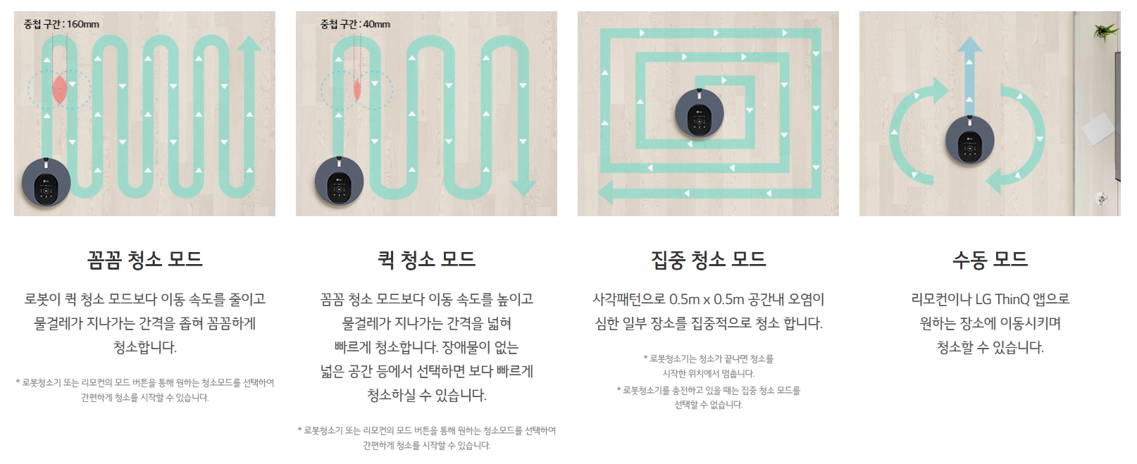 청소 모드 또한 모두 네가지를 제공하여 원하는 방식으로 청소할 수 있습니다. 지도 도면을 작성한 후에는 한군데를 집중적으로 청소하거나 반대로 청소를 하지 않도록 설정할 수도 있습니다. 다만 이러한 설정은 ThinQ 앱을 통해 가능합니다.