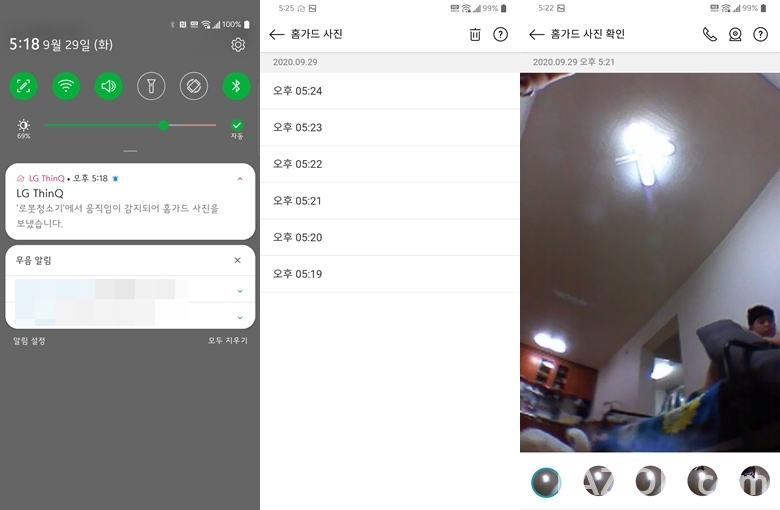 이 기능도 제법 재미있습니다. 식구들이 외출한 사이 내장된 카메라인 듀얼아이로 집안을 감시하고 사진도 찍을 수 있습니다. 그 쓰임새에 걸맞게 바깥에 나가 있어도 씽큐 앱을 통해 원격으로도 조작 가능한데, 홈가드를 시작하면 적당한 위치로 움직여서 홈가드 모드에 들어갑니다. 움직임이 감지되면 1분에 한번 꼴로 사진을 찍어서 보냅니다.