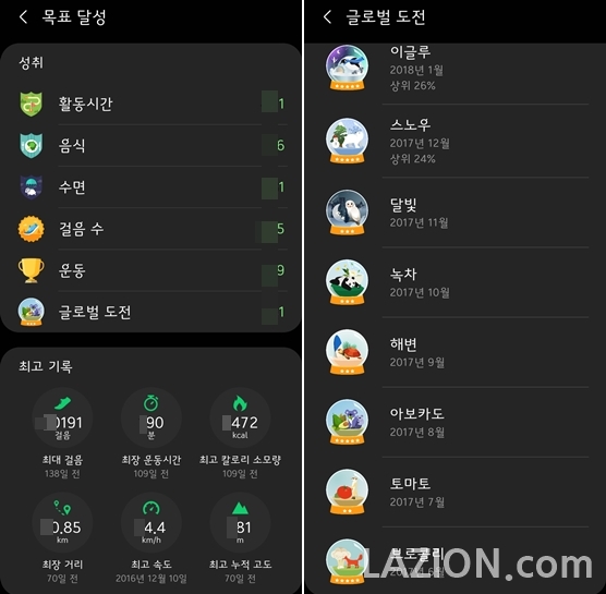 삼성 헬스는 여차하면 뒤집어 없고 종료하기 일쑤인 삼성전자의 앱/서비스 가운데에서는 정말 오래가는 서비스입니다. 갤럭시 워치 시리즈나 갤럭시 핏 등을 지원하며, 의료기기 사업에 갖고 있는 관심이 삼성 헬스에도 반영이 된 것 같습니다. 글쓴이도 글로벌 도전 목표는 꾸준히 채우고 있죠.