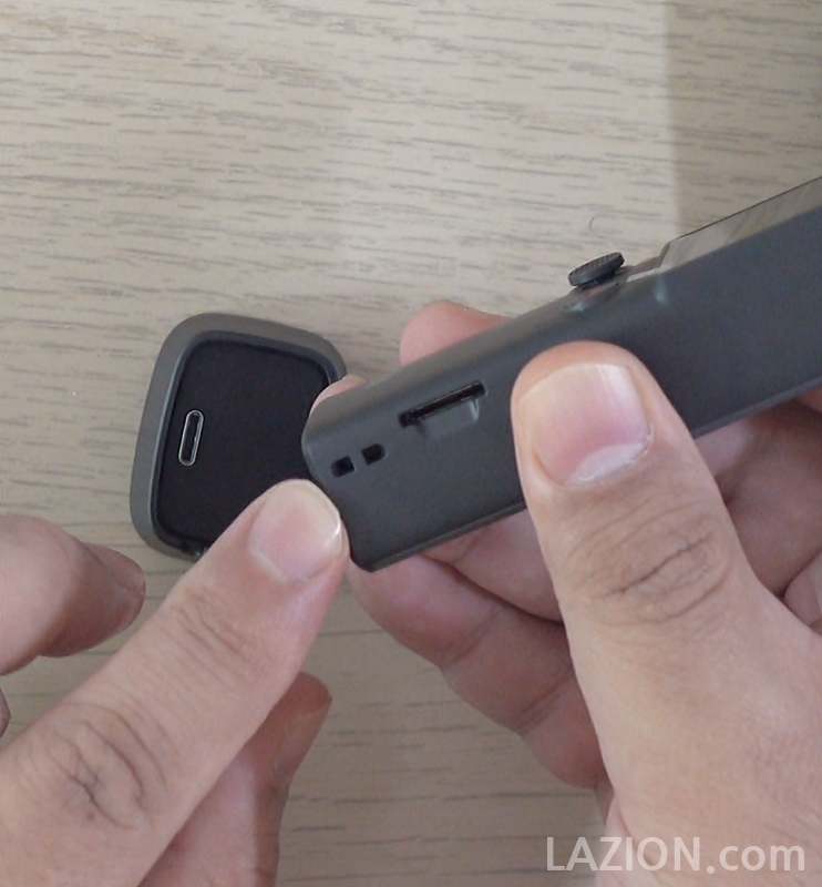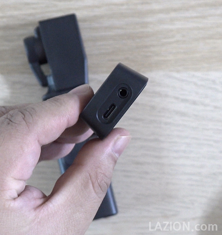 오즈모 포켓과는 달리 본체에 WiFi와 블루투스가 내장되어 있는지라 베이스는 대단한 역할을 한다기 보다는 바닥이 본체 바닥보다 좀 더 넓고 미끄러지지 않는 재질인지라 잠깐 세워놓는 쓰임새가 가장 큰 듯 합니다. 다만 여기서 끝나지는 않고 본체의 단자와 연결되어 USB 타입 C 뿐만 아니라 별도의 오디오 단자도 준비되어 있습니다.