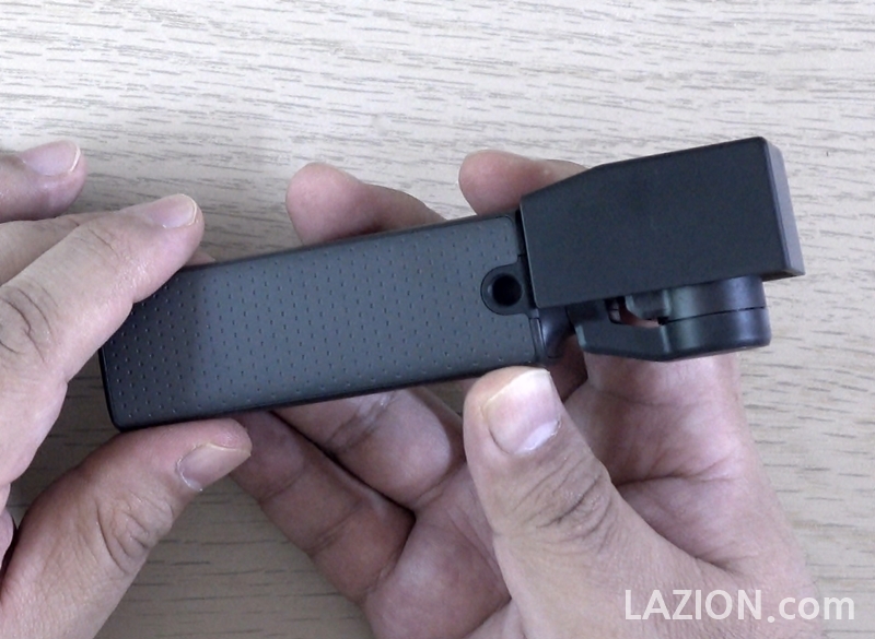 뒷면 또한 손으로 쥘 때 미끄러지지 않는 재질로 만들어져 있습니다. 그리고 윗쪽에 1/4인치 구멍이 있어 다른 기기와 연결할 수 있습니다...만, 짐벌 헤드와 너무 가까워서 일반적인 기기는 붙이기 힘듭니다. 적당한 젠더가 필요하죠.