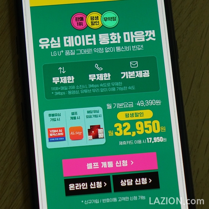월 32,950원(제휴카드 이용시 17,950원)에 음성과 문자가 무제한인 것은 물론이고, 무선 데이터는 11GB에 매일 2GB가 별도로 주어지며 이를 모두 소진한 경우 3Mbps로 데이터를 무제한으로 쓸 수 있습니다. 이 정도면 스마트폰 화면에서 보는 유튜브 등 동영상 서비스까지는 웬만큼 감당할 수 있는 수준이 되겠죠.