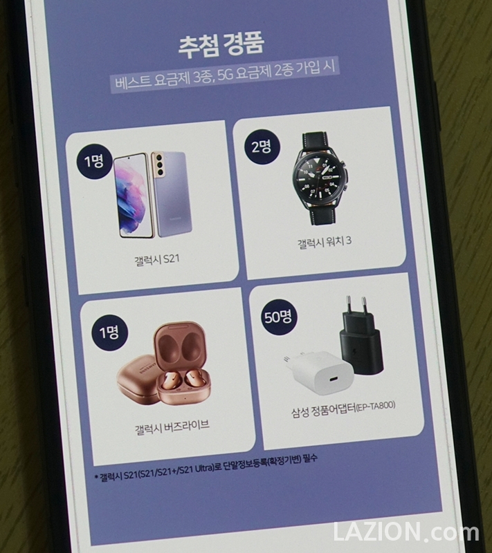 여기서 끝나면 섭하죠. 베스트 요금제 3종, 5G 요금제 2종에 가입하는 경우 추첨을 통해 갤럭시 S21 단말기 1명, 갤럭시 버즈라이브 1명, 갤럭시 워치3 2명, 삼성 정품 어댑터 50명에게 나눠드립니다.