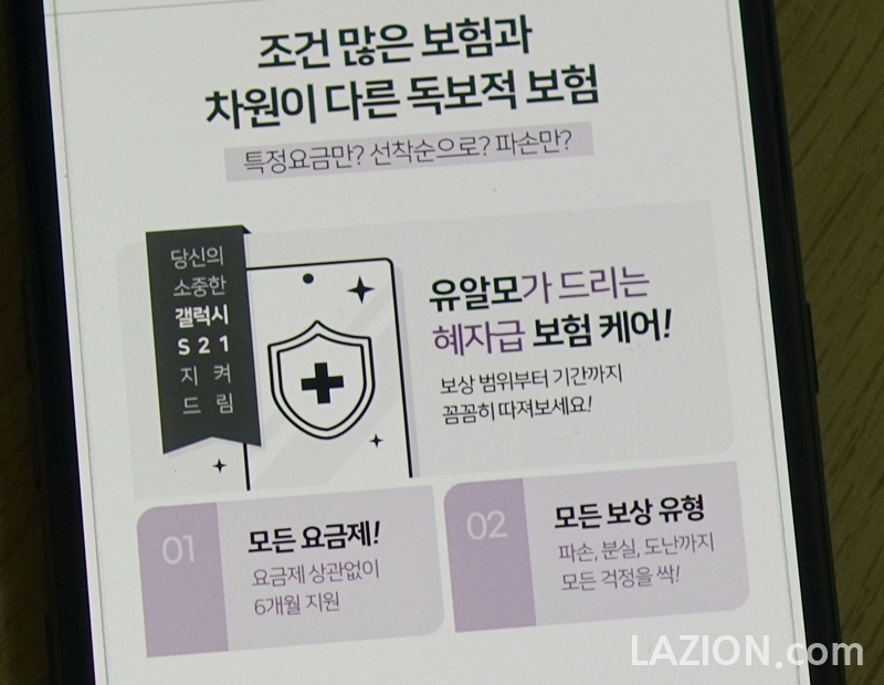 게다가 유알모는 요금만 차이나는 것이 아닙니다. 비싸디 비싼 최신 갤럭시 S21을 지켜줄 수 있는 보험 케어에서도 혜택이 있습니다.