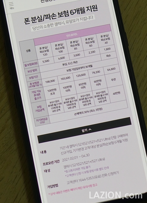 폰 분실/파손보험 40까지는 파손만, 폰 분실/파손보험 60이상 부터는 폰 분실, 도난, 파손 모두를 보상하며 유알모는 그 보험료를 무려 6개월동안 고객에게 제공합니다. 마음이 좀 든든해지는 지원인 셈입니다.