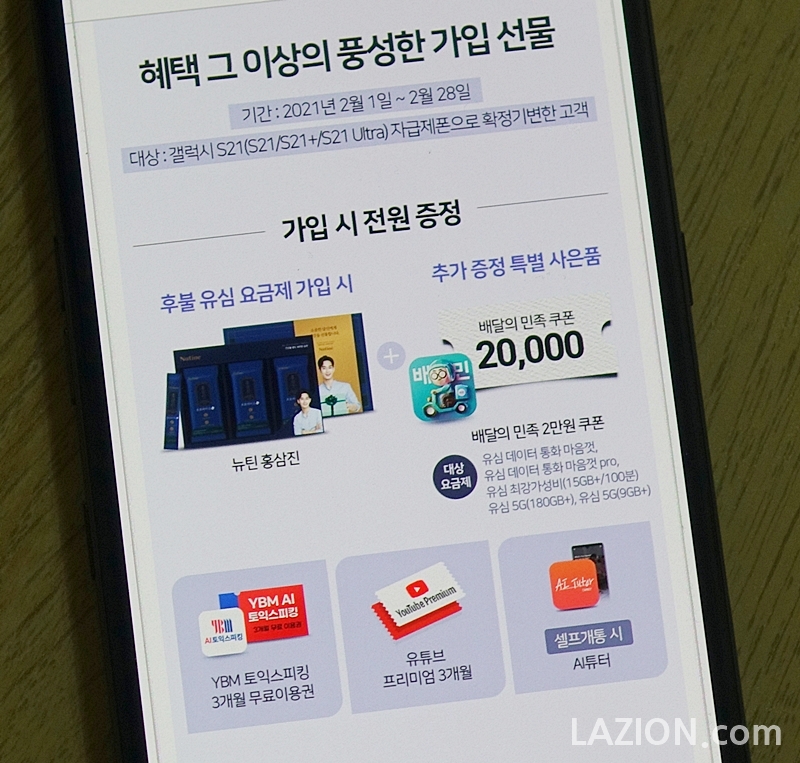 특히 2월 28일까지 갤럭시 S21로 확정기변한 고객에게는 뉴틴 홍삼진, YBM 토익스피킹 3개월 무료이용권, 유튜브 프리미엄 3개월 이용권을 주고, 특정 요금제를 고르시는 경우 배달의 민족 2만원 쿠폰도 받을 수 있습니다. 특히 셀프개통을 하는 경우에는 AI 튜터 이용권을 주는군요.