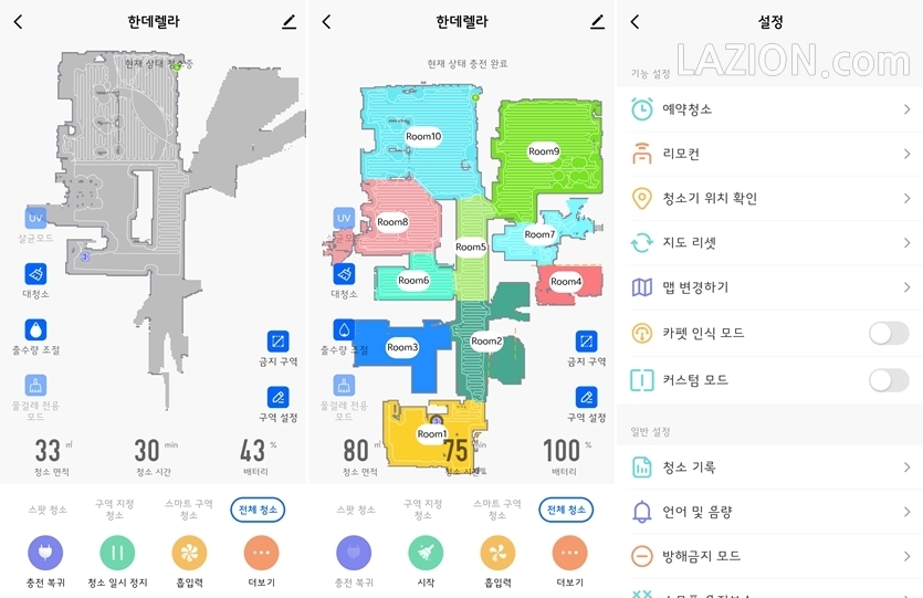 기본 리모콘없이 스마트폰 앱으로만 제어해야 해서 아쉽습니다만 앱 기능 자체는 무난한 수준입니다. 청소하는 가운데 이미 청소한 영역을 표시해 줄 수 있고 스마트 구역 청소 기능으로 원하는 구역만, 아니면 구역별로 순서를 정해 청소시킬 수 있어 편리합니다.