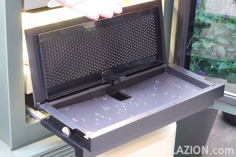 이렇게 문을 열면 나오는 2층의 서랍식 선반 위에 씨앗 키트를 한번에 6개씩 올려놓고 키울 수 있습니다. 흙없이 키우기 때문에 집안이 지저분해질 염려도 없고, 벌레가 꾀일 일도 없습니다.