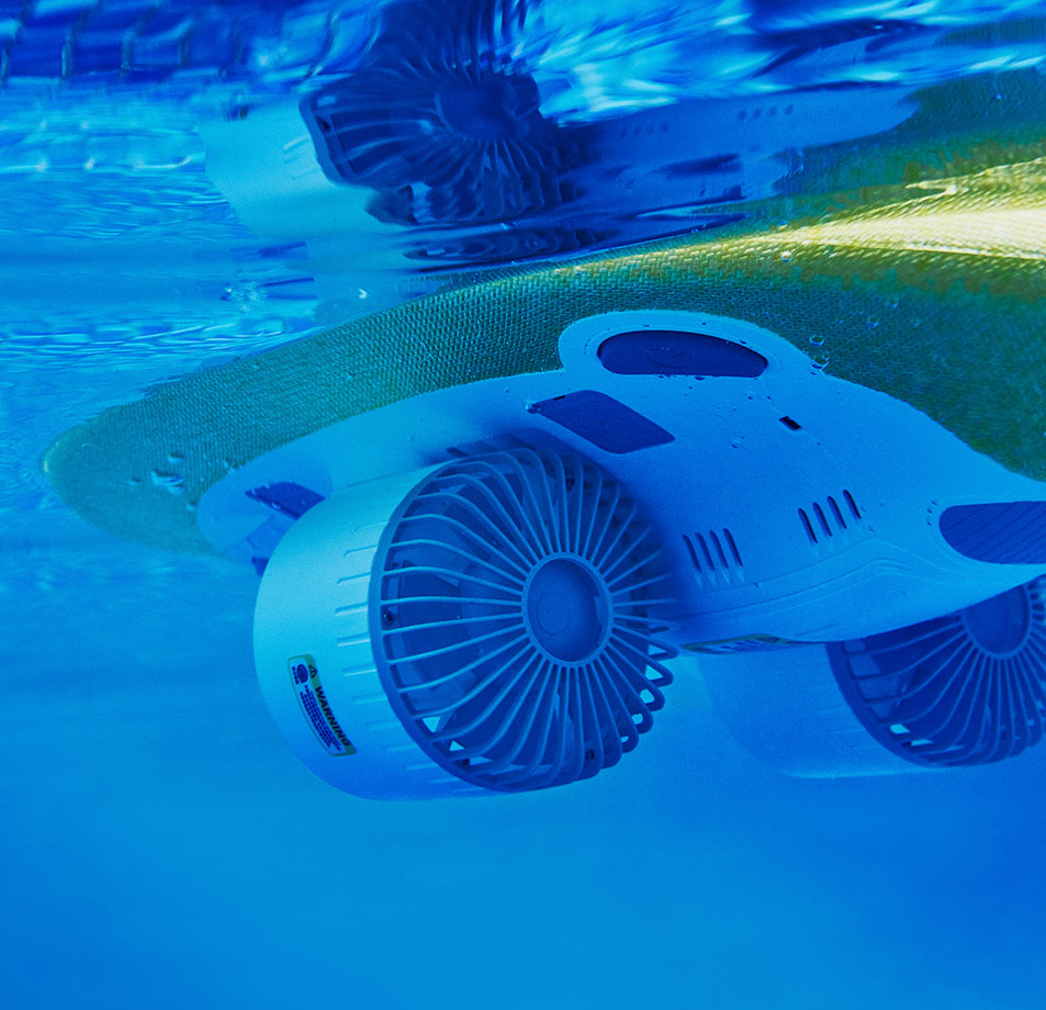 100kg까지 감당해주며 펌프 제트 듀얼 프로펠러 모터를 이용하여 최대 출력 300W에 1.3m/s의 속도까지 낼 수 있습니다. 시속으로는 4.68km/h가 되니 성인의 걸음보다 약간 빠른 정도가 되겠네요. 수영장에서는 별 문제없겠지만 흐름이 있는 강이나 바다에서는 충분한 출력이 아닐 수도 있겠습니다.
