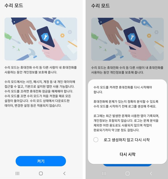 이용자는 스마트폰 설정에서 [배터리 및 디바이스 케어]-[수리 모드]를 실행하면 스마트폰이 재부팅되고 이후에는 사진이나 메시지 등 개인 데이터에 접근할 수 없으며 기본 설치 앱만 이용 가능합니다. 수리가 끝난 후 패턴/지문 인식을 거쳐 이용자가 수리 모드를 종료하고 재부팅하면 다시 정상적으로 모든 데이터에 접근이 가능하죠.