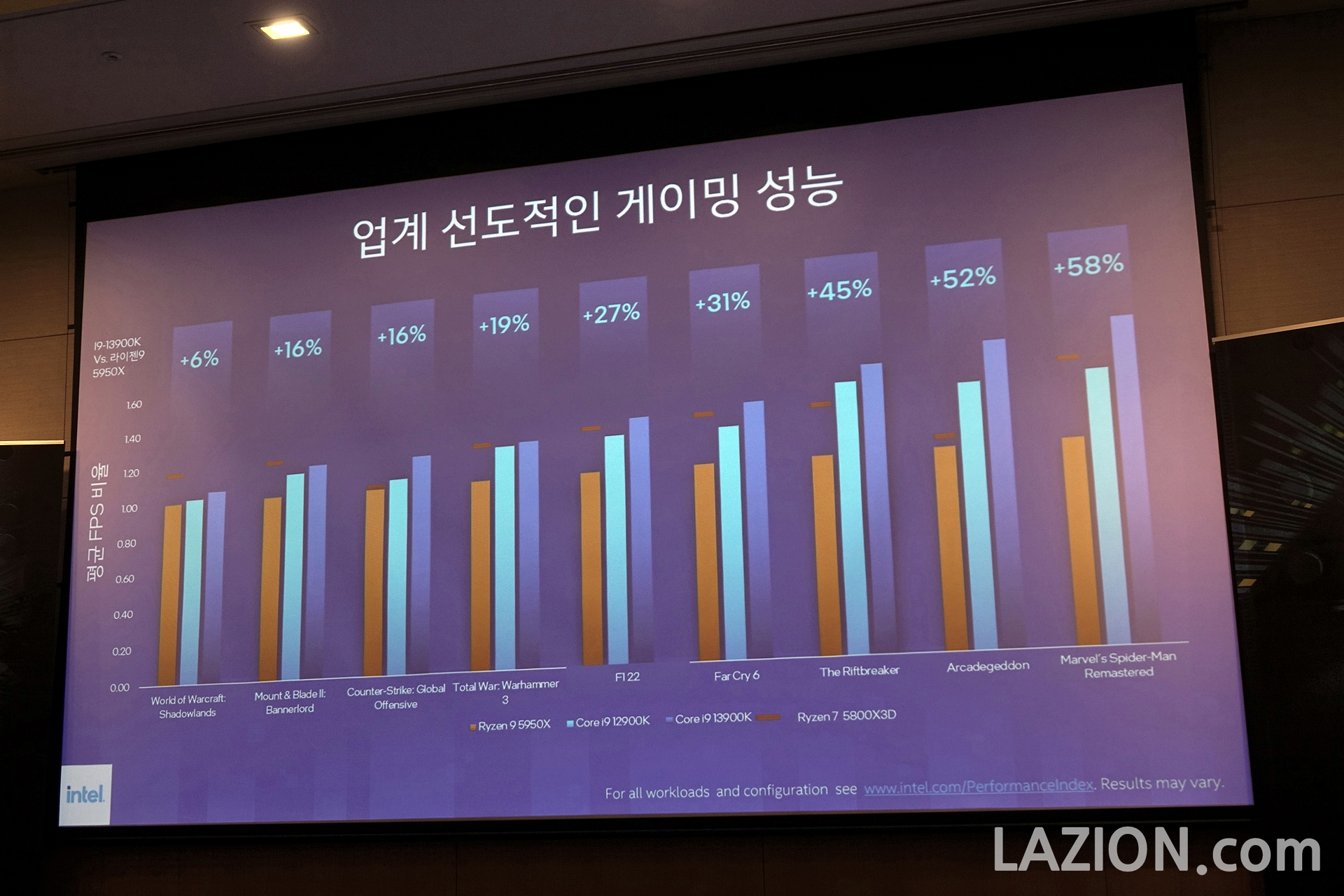 그 결과가 이런 성능 차이입니다. 게임에 특화된 라이젠7 5800X3D를 가지고 와도 제법 차이가 납니다. 여기에는 없지만 얼마 전 발표한 라이젠 프로세서에 비해서도 나은 편으로 평가받고 있습니다.