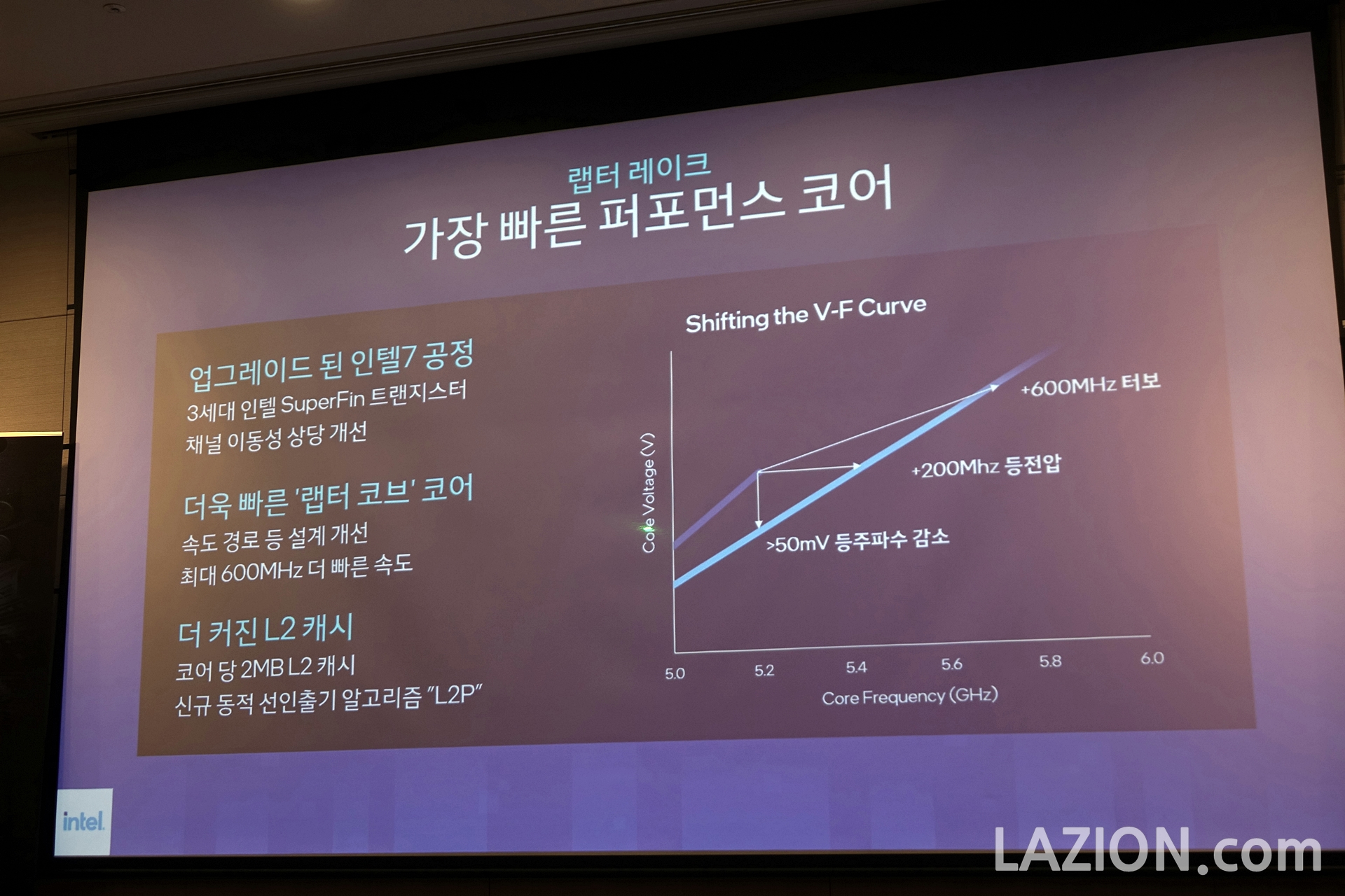 12세대에서 제법 효과를 발휘했던 퍼포먼스 코어(P코어)와 에피션트 코어(E코어)를 결합하여 구성한 하이브리드 아키텍처를 물려받아 발전시켰는데, 여기에다가 P코어의 클럭 주파수를 높이고 E코어 수를 늘렸으며 L2 캐시 또한 커졌습니다. 공정 또한 Intel7 공정을 그대로 쓰면서 획기적인 변화는 없지만 당연히 성능은 좋아질 수 밖에 없죠.