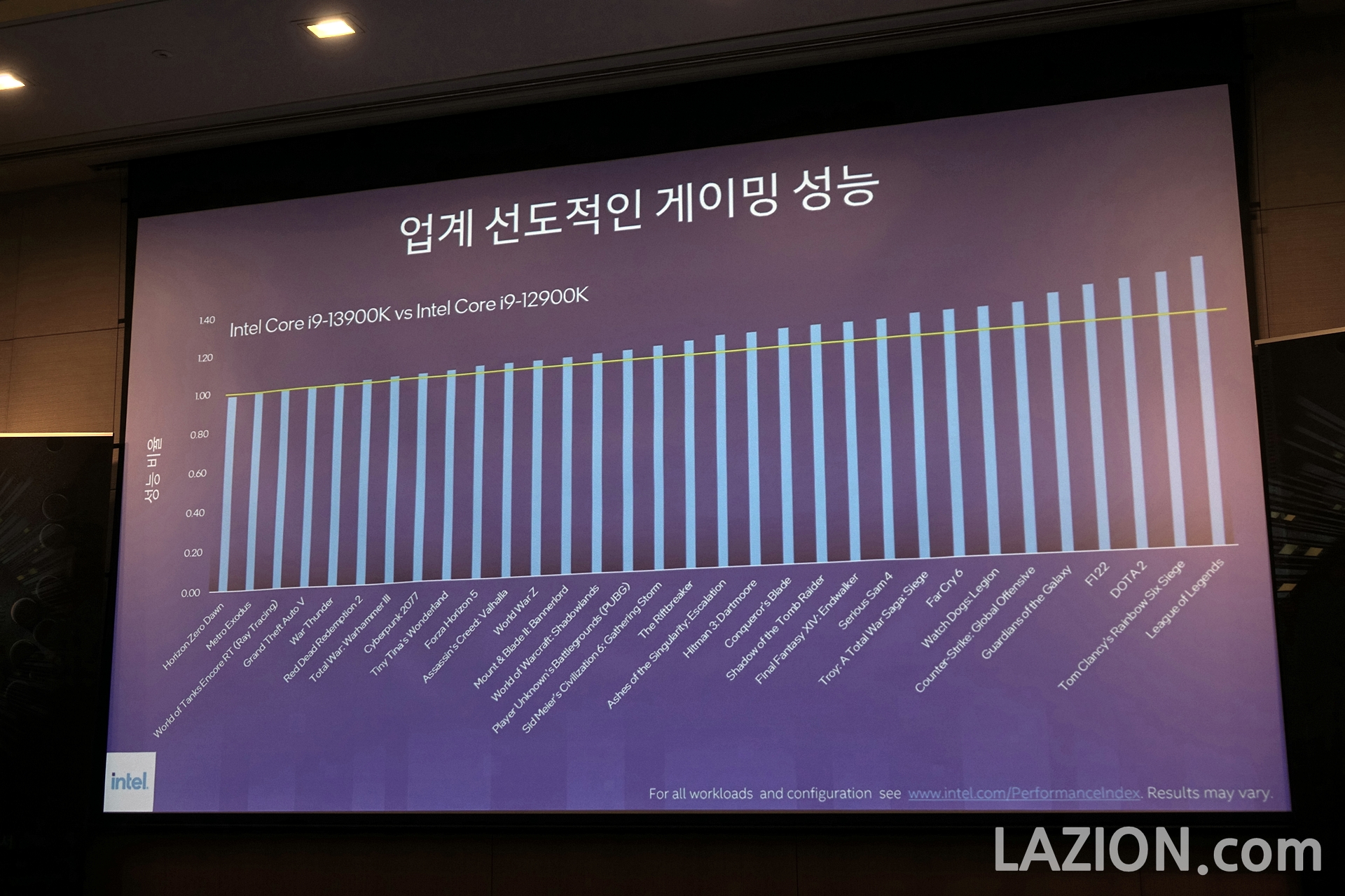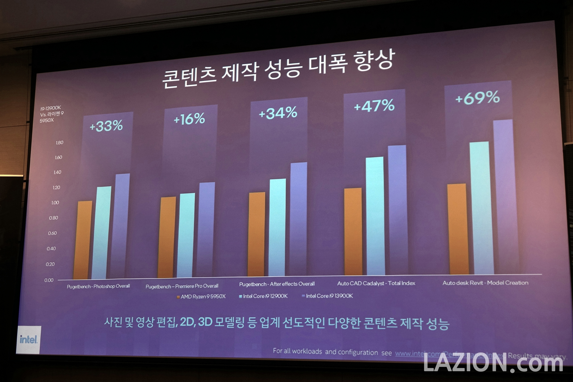 12세대에서 제법 효과를 발휘했던 퍼포먼스 코어(P코어)와 에피션트 코어(E코어)를 결합하여 구성한 하이브리드 아키텍처를 물려받아 발전시켰는데, 여기에다가 P코어의 클럭 주파수를 높이고 E코어 수를 늘렸으며 L2 캐시 또한 커졌습니다. 공정 또한 Intel7 공정을 그대로 쓰면서 획기적인 변화는 없지만 당연히 성능은 좋아질 수 밖에 없죠.