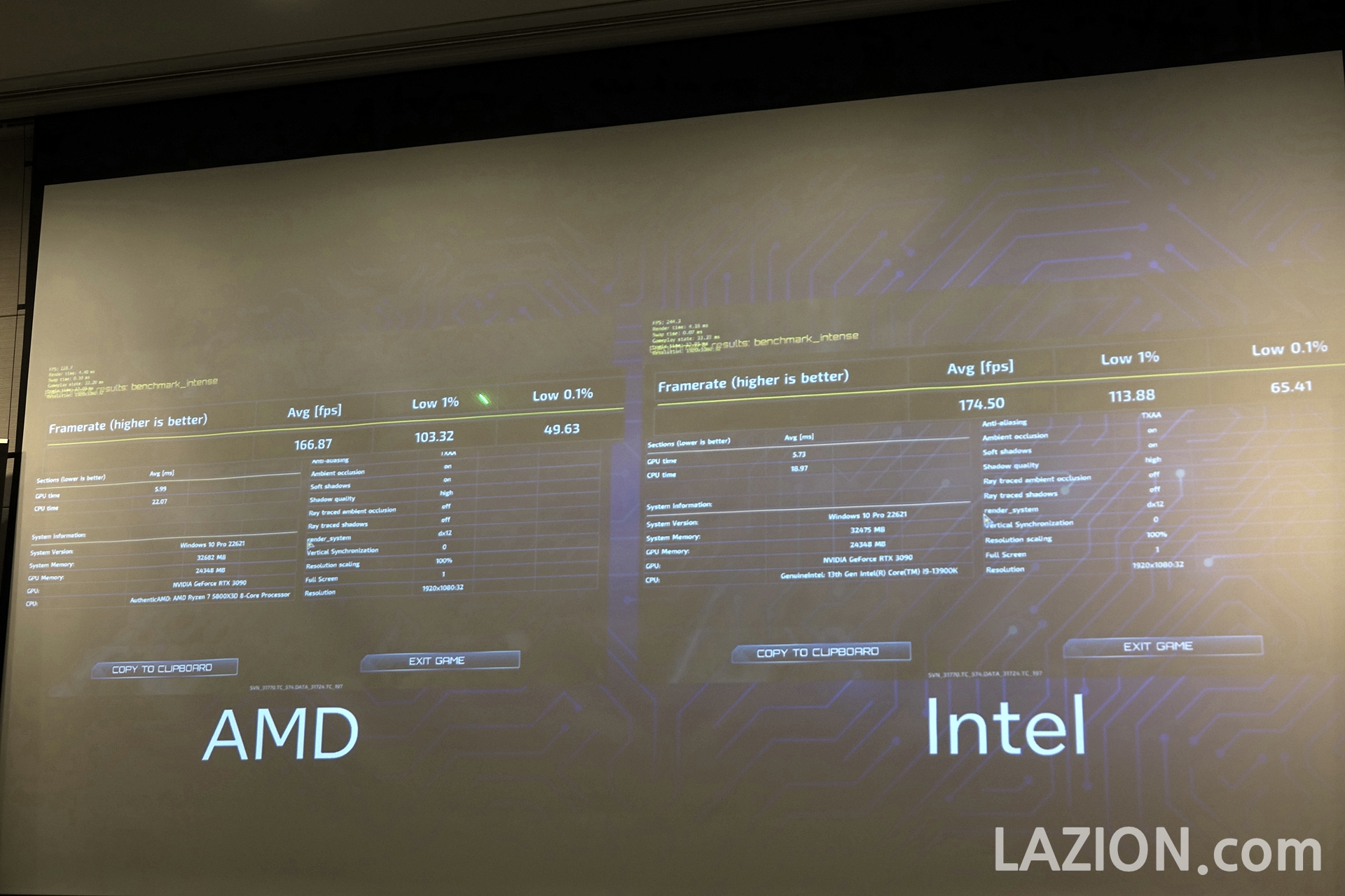 그 결과가 이런 성능 차이입니다. 게임에 특화된 라이젠7 5800X3D를 가지고 와도 제법 차이가 납니다. 여기에는 없지만 얼마 전 발표한 라이젠 프로세서에 비해서도 나은 편으로 평가받고 있습니다.