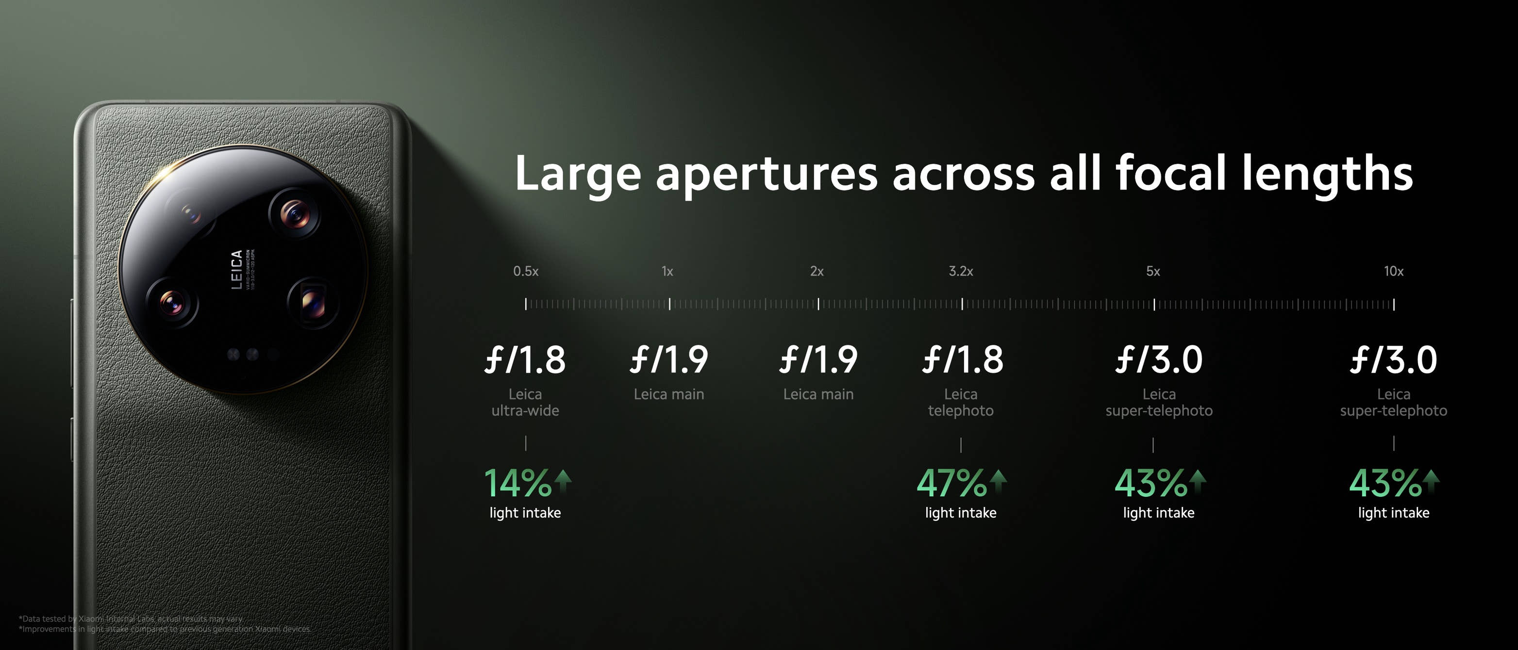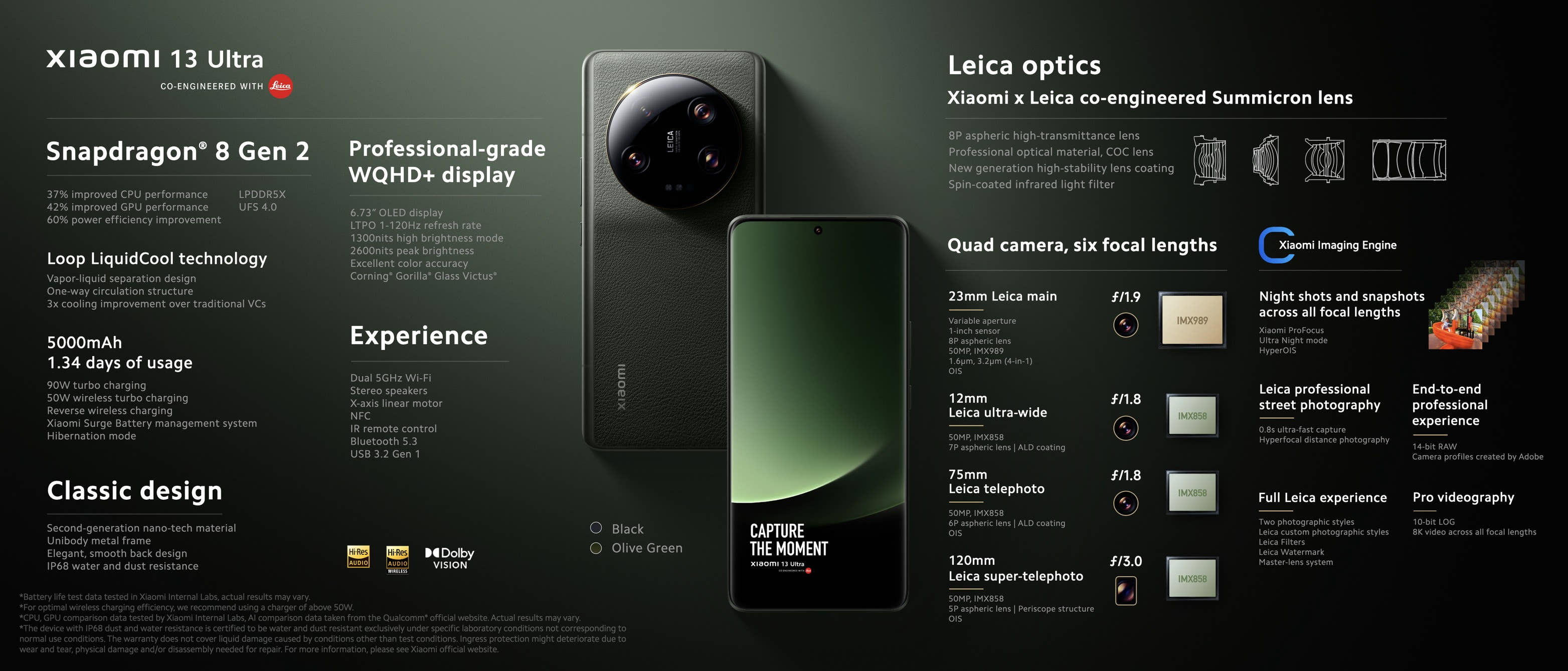 덕분에 샤오미 13 울트라는 12mm(초광각), 23mm(광각), 75mm(망원), 새로운 120mm(초망원)에 이르는 초점 거리를 커버하는 라이카 광학 렌즈가 장착된 쿼드 카메라 시스템과 센서의 화각을 이용한 디지털 줌을 통해 추가로 46mm 및 240mm 거리도 제공합니다. 3.2배 줌까지는 f/2.0 이상의 밝기를 제공한다는 점도 눈여겨 볼만합니다.
