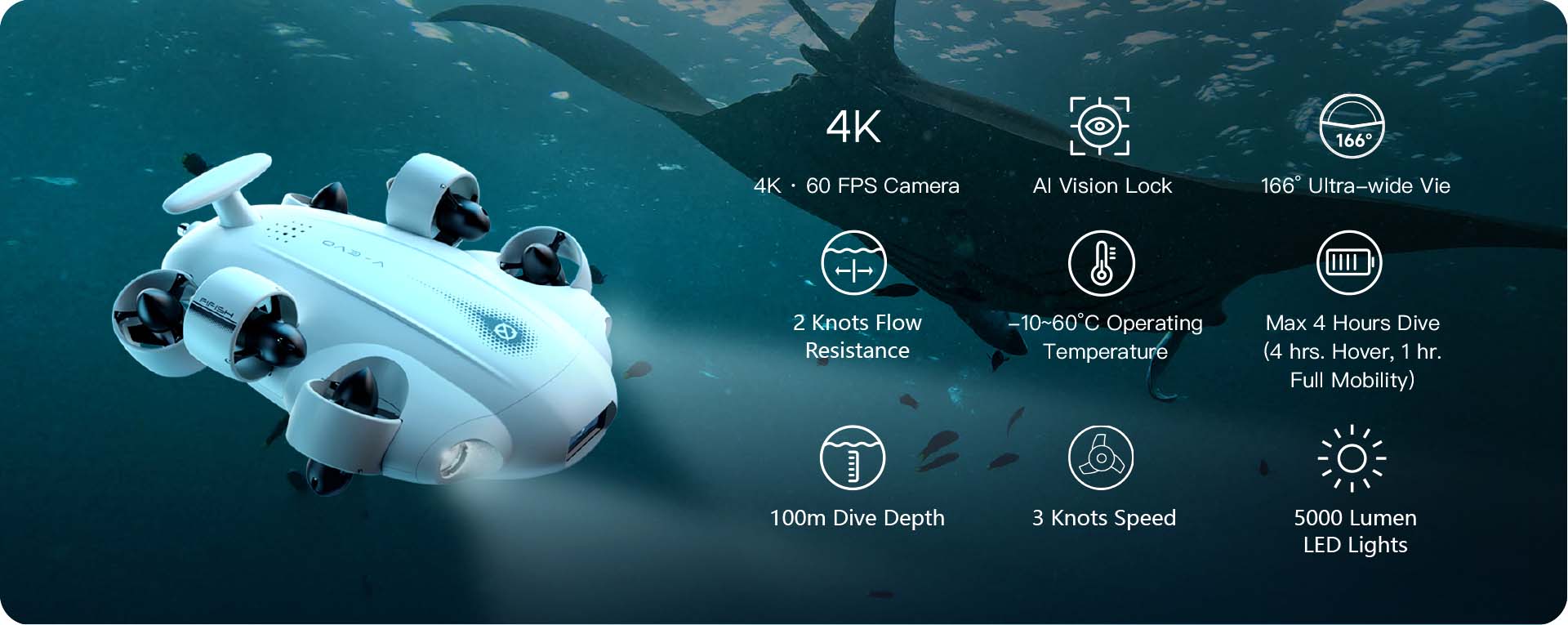 FIFISH V-EVO는 4K 60FPS에 166도라는 넓은 화각을 이용하여 바닷속에서도 향상된 디테일로 부드러운 슬로우 모션 영상을 초고화질로 촬영할 수 있으며 특정 피사체에 초점을 고정시킬 수 있는 AI VISION LOCK 기능도 제공합니다.