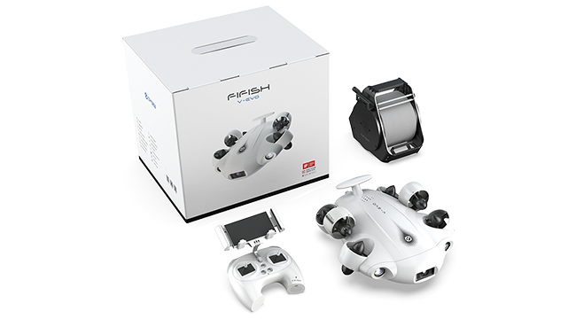 FIFISH V-EVO의 표준형은 튼튼한 전용 박스에 FIFISH V-EVO 수중 드론, 테더 릴, 리모컨, VR 고글, 충전기가 기본으로 들어 있다고 하는데, VR 고글은 좀 애매해서 업체 측에 확인해 봐야 할 듯 합니다.