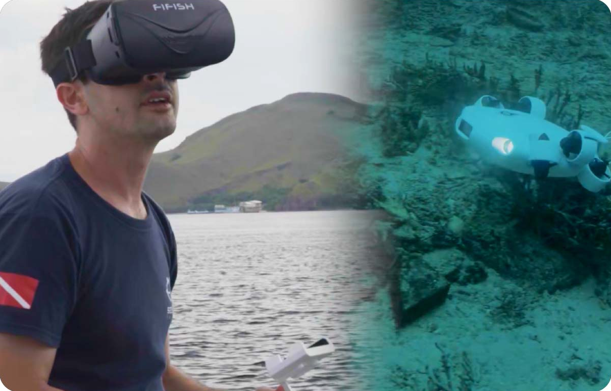 FIFISH V-EVO의 조종은 스마트폰 앱으로 가능하지만 VR 헤드셋을 이용할 수도 있습니다.