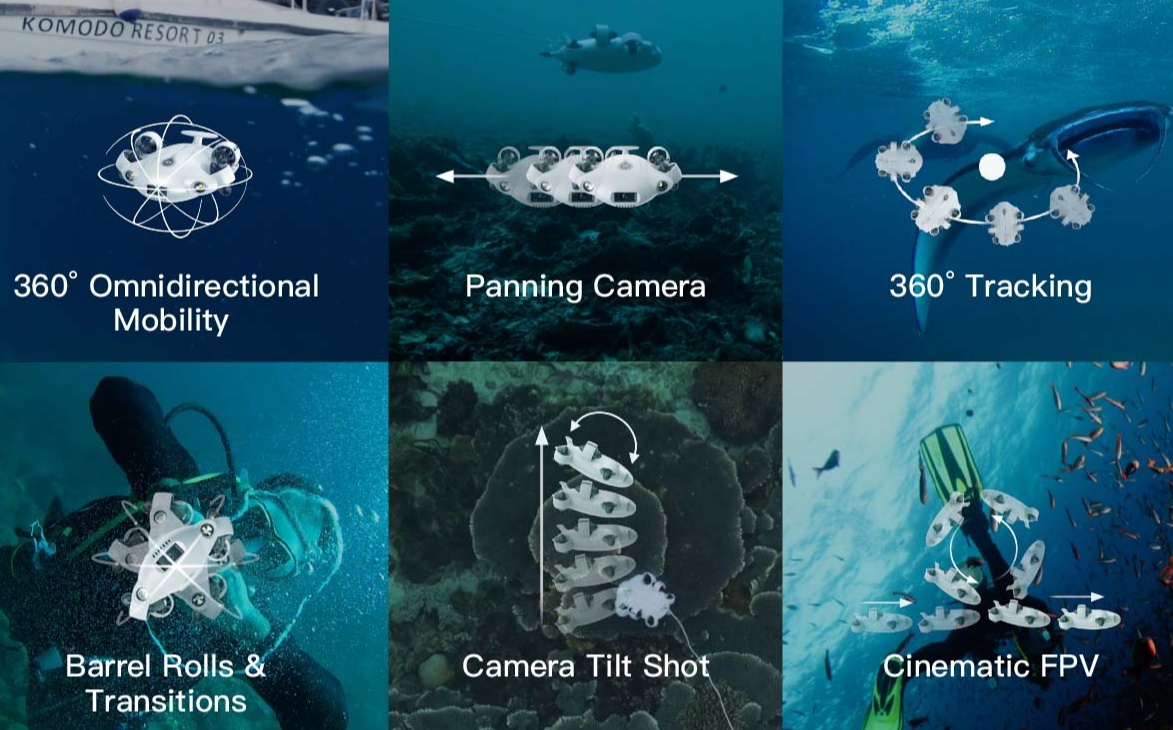 여기에 FIFISH V EVO 고유의 6개로 구성된 추진기를 바탕으로 최대 시속 3노트의 속도를 낼 수 있으며 2노트의 해류에 저항할 수 있습니다. 360도 전방향 이동, 카메라 패닝, 360도 추적, 배럴 롤과 전환, 틸트 샷, 시네마틱 1인칭 촬영 등 다채로운 촬영 능력을 보유합니다.