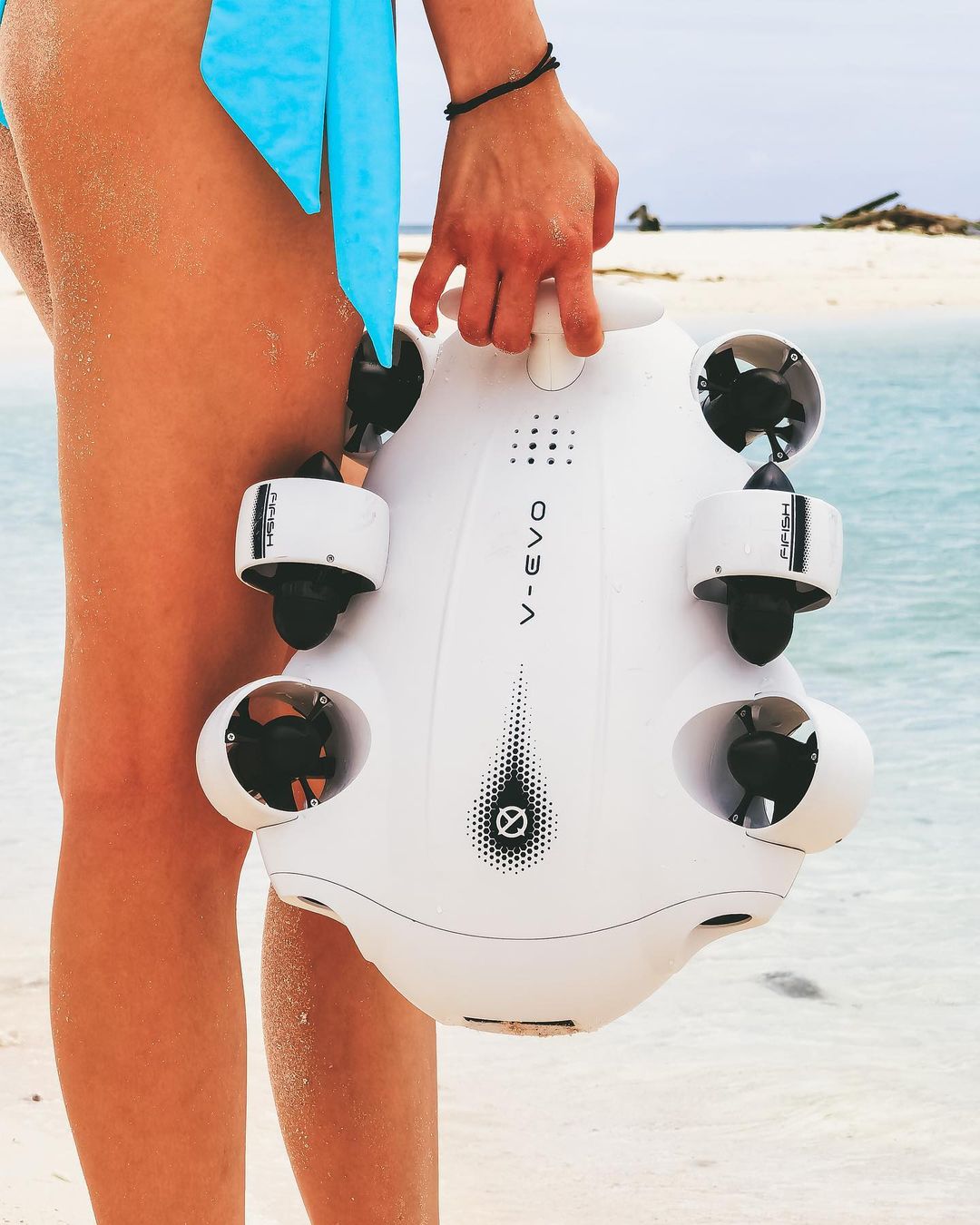 파이피시 V-에보(FIFISH V-EVO)는 보시다시피 파이피시 라인업의 최신 모델입니다. 이 제품의 가장 큰 특징은 4K 60FPS 영상 촬영이 가능한 카메라와 6개의 추진 모터를 이용해 360도 전방향 이동 기능을 갖춘 최초의 수중 드론이라는 점입니다.