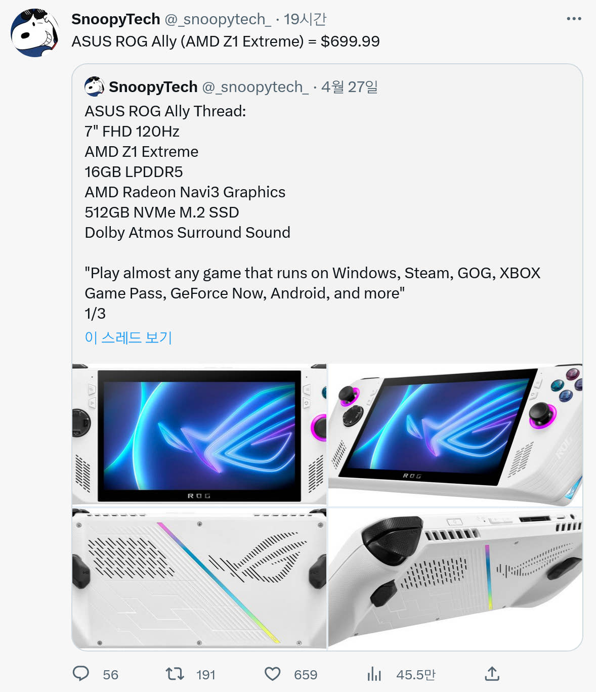 이미 ASUS ROG Ally에 대한 정보를 흘린 전적이 있는 SnoopyTech가 밝힌 바에 따르면 이 제품의 가격은 699.99달러라고 합니다.