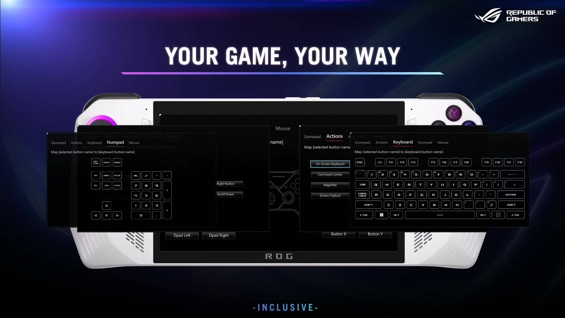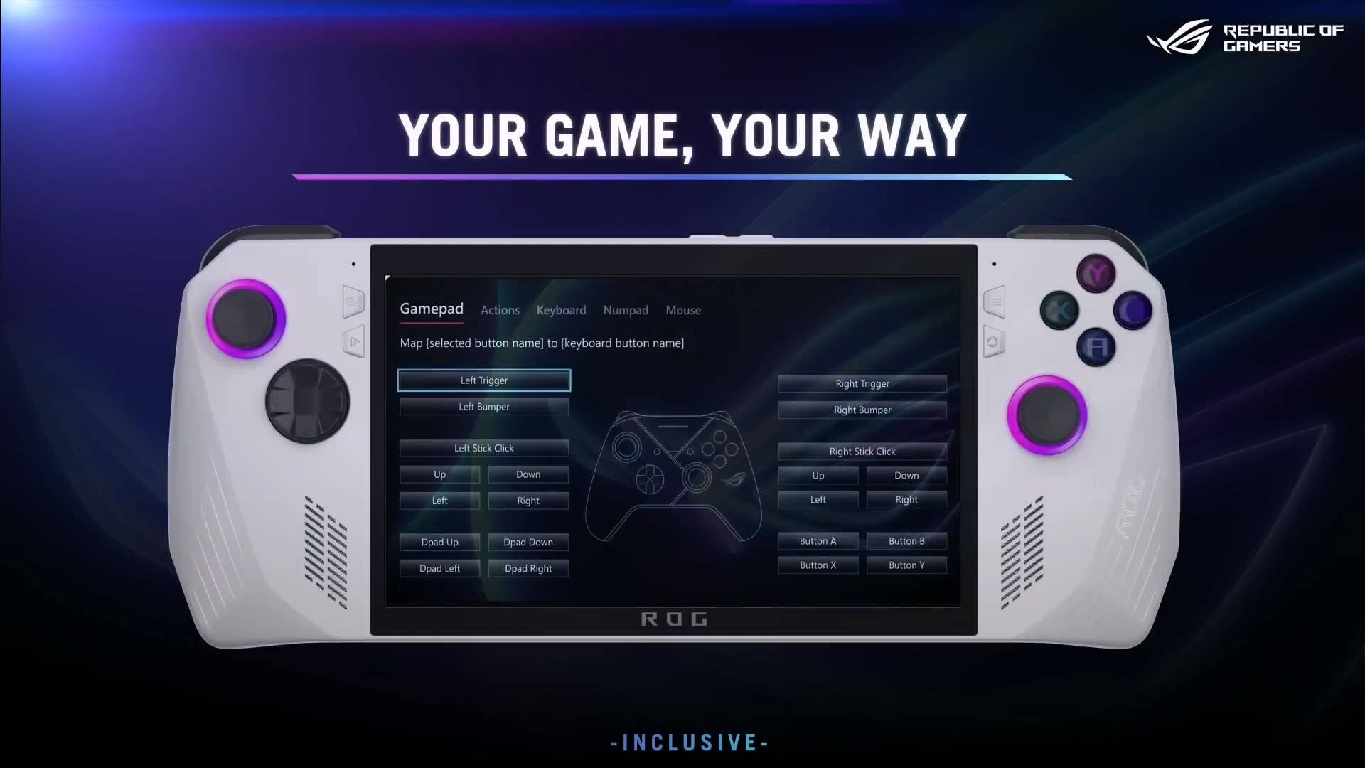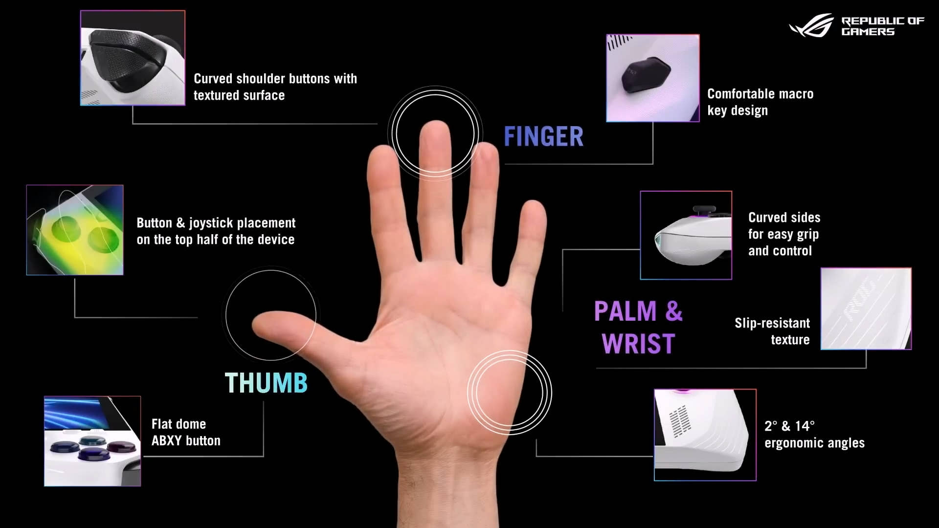 | 컨트롤 및 입력 | A B X Y 버튼 D-pad L & R Hall Effect 아날로그 트리거 L & R 범퍼 뷰 버튼 메뉴 버튼 커맨드 센터 버튼 Armoury Crate 버튼 2 x 할당 가능한 그립 버튼 Thumbsticks: 2 x 전체 크기 아날로그 스틱 (전용 터치) Haptics: HD haptics 6-Axis IMU |