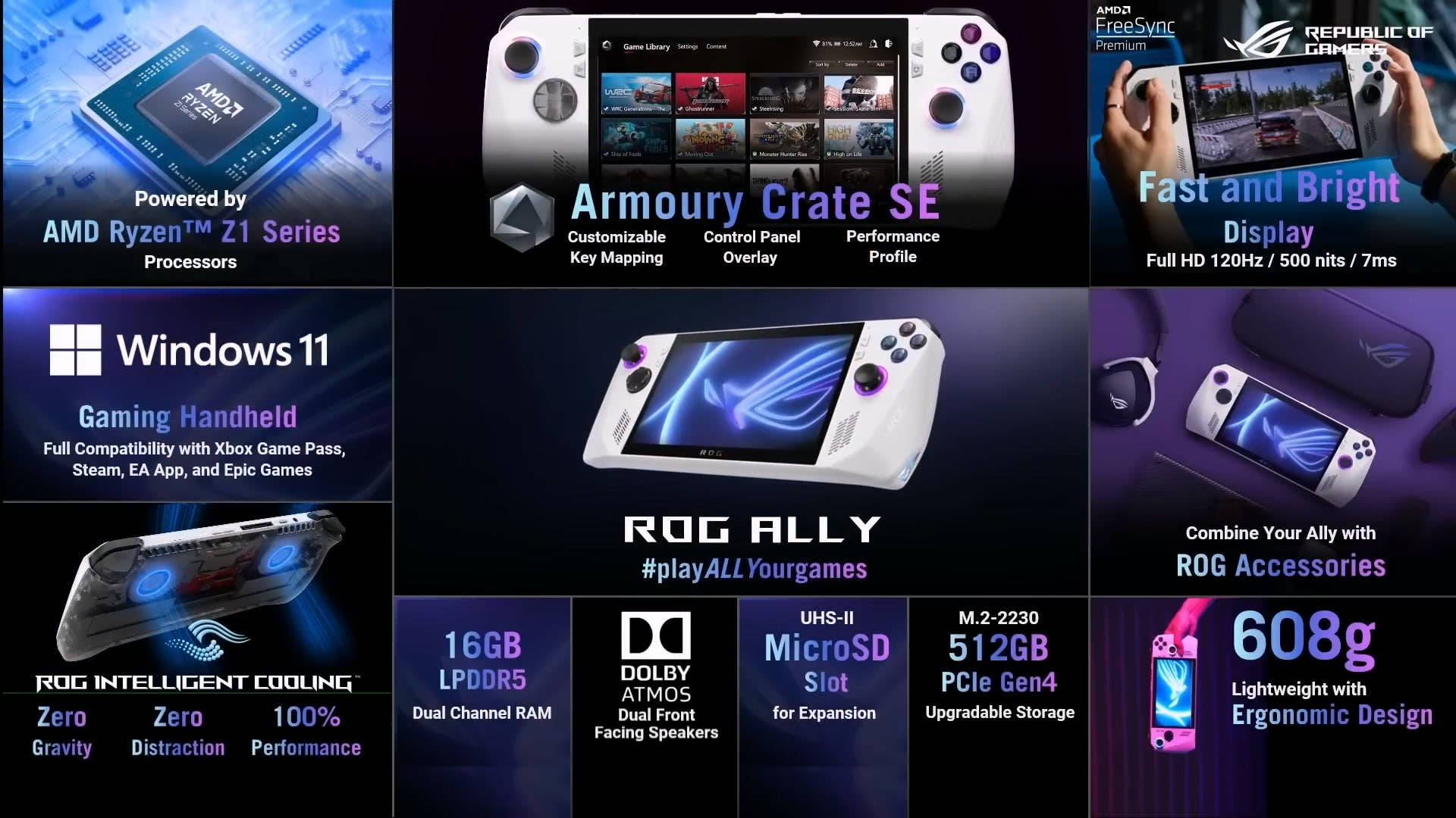 최고의 성능을 내세운 윈도우 11 기반 휴대용 게임기 ASUS ROG Ally(엘라이; 에이수스 코리아 기준)가 정식으로 공개되었습니다. 이미 많은 이야기가 라지온에 올라왔던 만큼 중요한 것부터 정리해 보겠습니다.