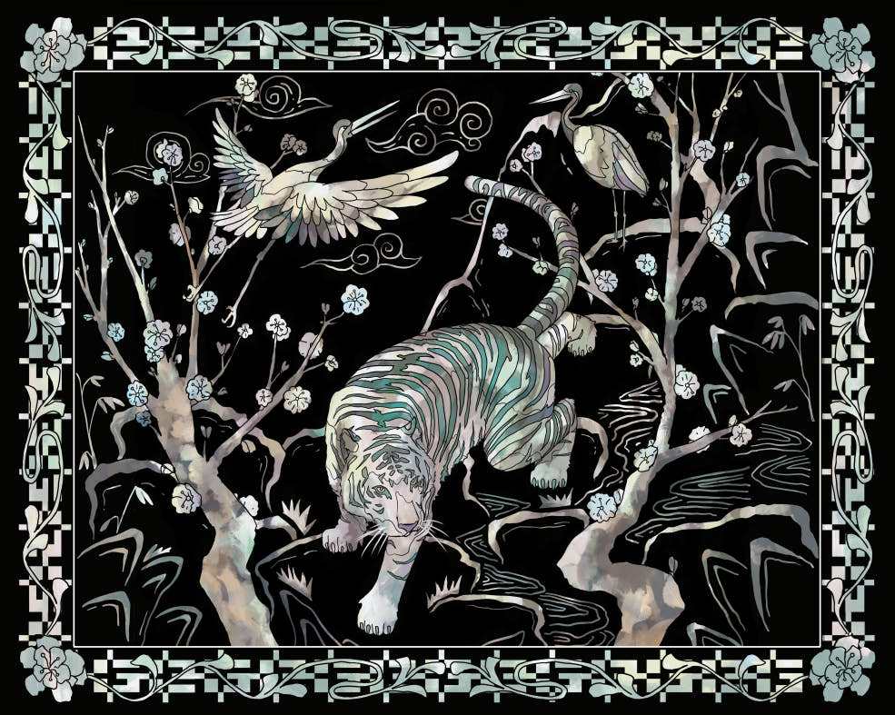 보자마자 아시겠지만 조개 껍데기로 장식하는 전통적인 예술 양식인 자개로 장식된 아름다운 마우스 패드입니다. 게다가 대놓고 Minhwa of Pearl Collector's Edition이라고 해서 한국의 전통 민화에서 아이디어를 받았다고 소개하고 있습니다. 그래서 그런지 호랑이와 학, 나무의 배치가 제법 눈에 익습니다.