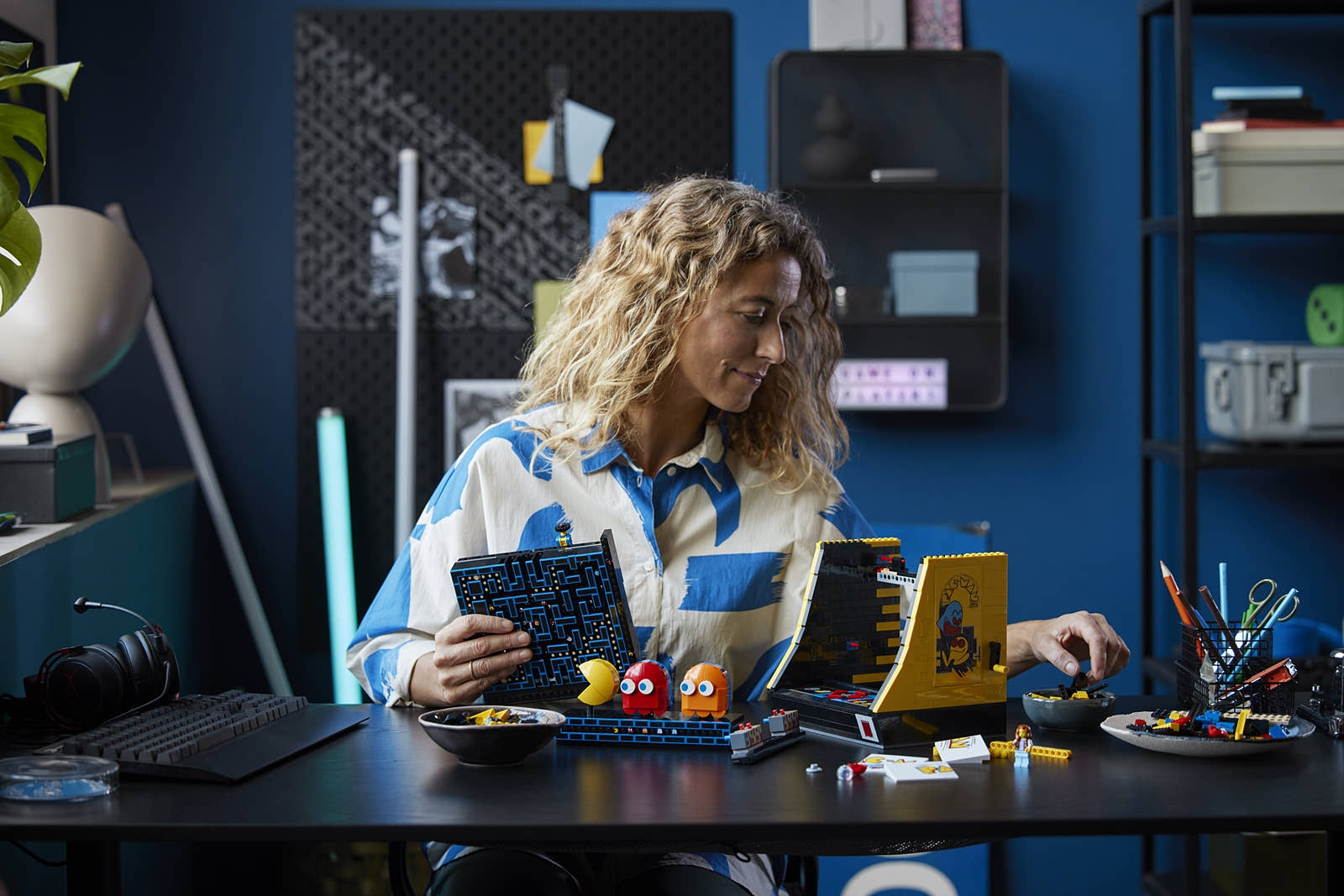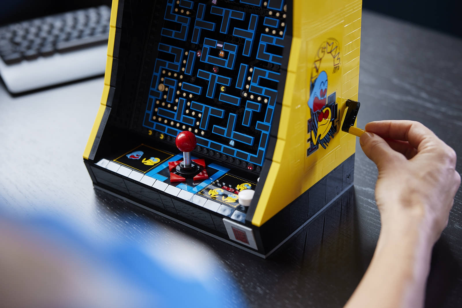 캐비닛 내부에 숨겨진 아케이드에서 팩맨을 플레이하는 미니피겨(여성)의 작은 비네트.