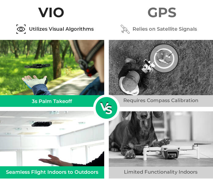 호버 카메라 X1은 독특하게도 위치 확인에 시각적인 요소를 활용하는 VIO(Visual Inertial Odometry) 기술과 ToF 레이저 고도 측정 시스템을 사용합니다. 덕분에 3초 만에 비행이 가능하고 야외-실내 촬영을 끊김없이 진행할 수 있다는군요.