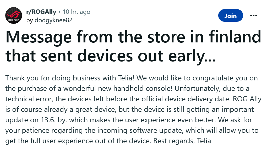 이 내용이 사실이면 Telia는 큰 실수를 한 셈이네요. ROG Ally라고 하는 상품은 하드웨어와 소프트웨어의 조합인데 소프트웨어가 아직 미완성인 상태에서 소비자에게 배송된 셈입니다. 이게 1명한테만 간 건지, 아니면 여러 명한테 간 건지는 아직 밝혀진 바 없습니다.
