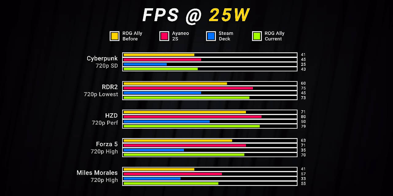 실제로 그가 올린 자료를 살펴보면 720p 기준으로 퍼포먼스 모드(TDP 15W)에서는 평균 29%, 터보 모드(TDP 25W)에서는 평균 17%의 성능 향상을 이뤄냈습니다. 게임 타이틀마다 다르지만 거의 50%에 가까운 성능 향상을 이룬 경우도 있습니다.