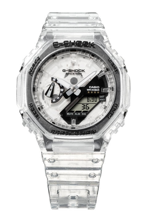 팔각형 모양의 독특한 베젤을 가진 GA-2100과 GMA-S2100을 기반으로 스켈레톤 문자판이 들어갔습니다. 시침과 눈금도 스켈레톤으로 처리하여 문자판 아래 모듈이 보이도록 디자인했습니다.