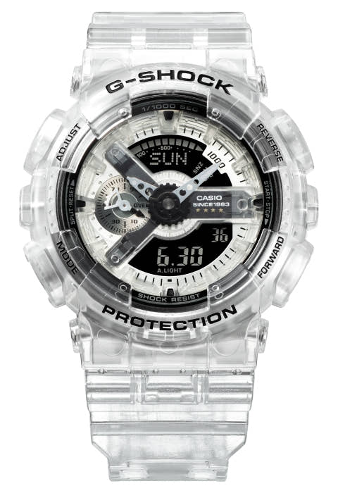 디지털과 아날로그 시계가 함께 있는GA-110과 GMA-S110에 스켈레톤 소재의 센터 케이스와 투명 수지 소재의 사이드 버튼, 클리어 컬러로 통일감을 더했습니다.