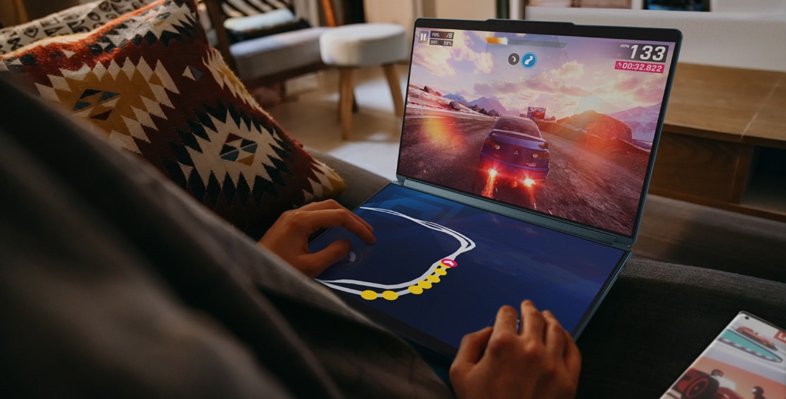 요가북 9i의 가장 큰 특징이랄 수 있는 제품 양쪽의 13.3인치 퓨어사이트(PureSight) OLED 스크린은 2880x1800의 높은 해상도를 자랑하며, 초광각 시야각을 제공합니다. 베사(VESA) 디스플레이 HDR 트루블랙500 인증을 획득한 초고명암비를 구현하여 어두운 콘텐츠도 또렷하게 표현할 수 있으며 밝기는 400nit입니다.