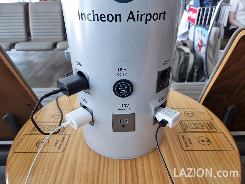 보시면 알겠지만 명성있는 인천공항인 만큼 정말 남부럽지 않습니다. 익숙한 220V 단자가 있어서 노트북이나 자신이 가져온 충전기를 꽂을 수 있으며, USB 케이블만 있어도 QC 3.0이 지원되는 USB 단자가 있습니다. 여기에 더해 해외 여행자를 위해 110V 플러그까지 있습니다.