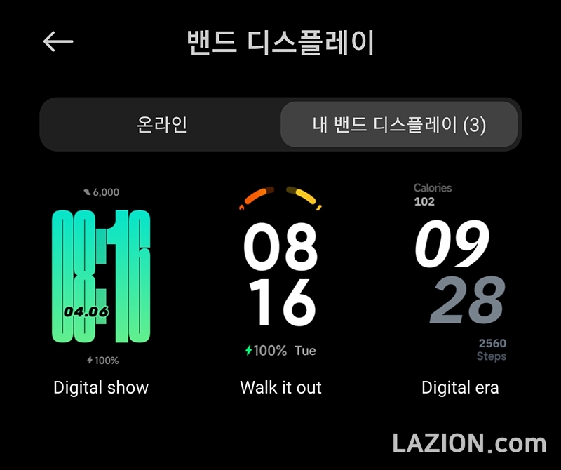 워치 페이스(밴드 디스플레이)는 100개 이상을 갖춰놨다고 하는데 열악 그 자체인 삼성 갤럭시 핏 시리즈보다는 낫지만 그래도 좀 아쉬운 편입니다. 다양하기 보다는 비슷한 걸 조금씩만 바꿔서 숫자만 채운 느낌이 들기 때문이지요.